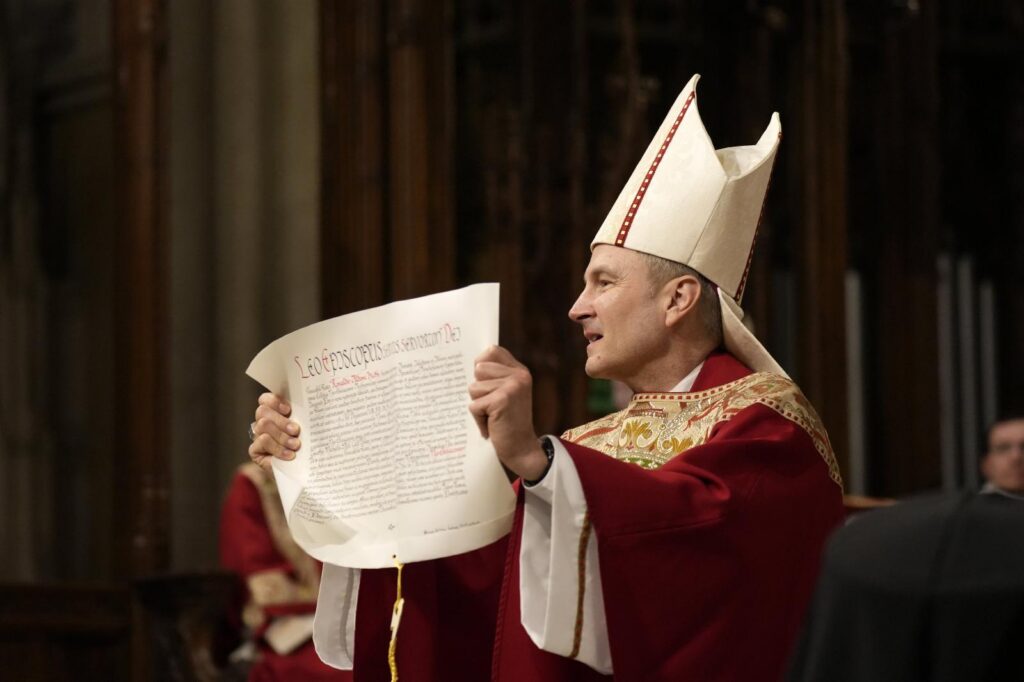 Following the entrance procession to the sanctuary, Cardinal Dolan greeted the congregation from the cathedra, the episcopal throne, before Cardinal Christophe Pierre, the apostolic nuncio to the U.S., prepared to read the apostolic letter in which Pope Leo formally appointed Archbishop Hicks as the shepherd of New York.