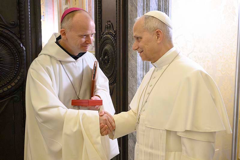 Pope Leo XIV greets Norwegian Bishop Erik Varden of Trondheim after the bishop led the final day of the Roman Curia’s annual Lenten retreat in the Pauline Chapel at the Vatican Feb. 27, 2026. The Norwegian bishop was chosen by Pope Leo to preach at the Feb. 22-27 Lenten retreat, which reflected on the theme, “Illuminated by a Hidden Glory.” (OSV News photo/Simone Risoluti, Vatican Media)