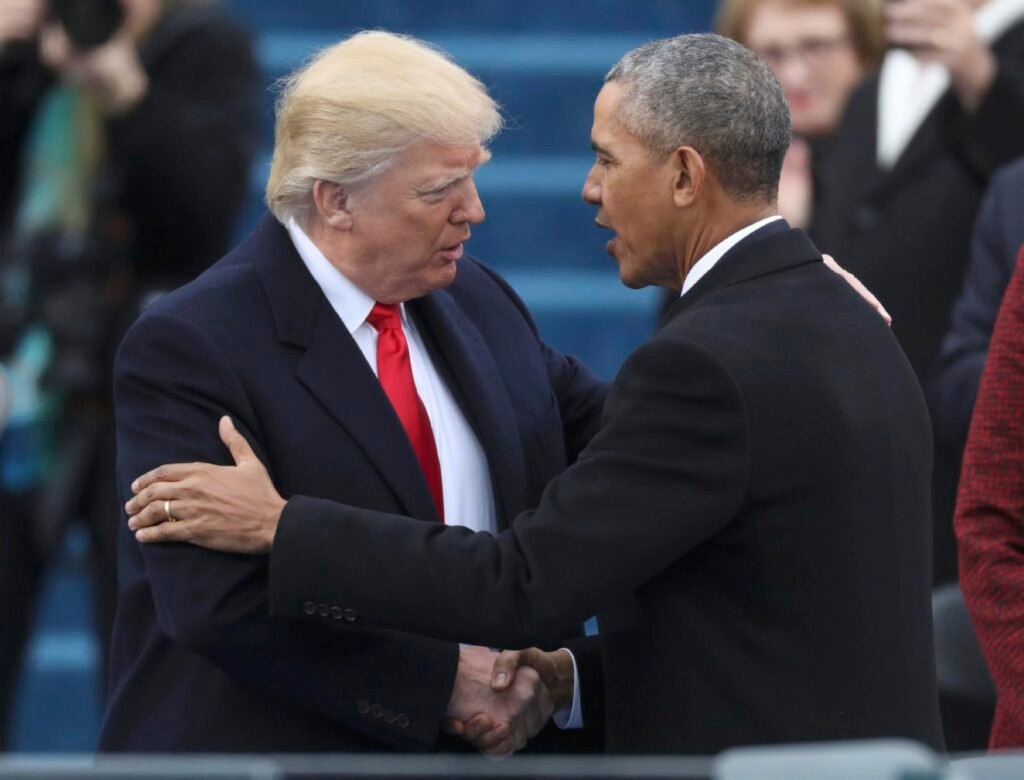 U.S. President Donald Trump greets outgoing President Barack Obama before Trump’s Jan. 20, 2017, swearing-in as the country’s 45th president at the U.S. Capitol in Washington. Black Archbishop Edward J. Weisenburger of Detroit and Cardinal Blase J. Cupich of Chicago are calling for President Donald Trump to apologize for a racist video of the Obamas posted from his social media account. (OSV News photo/Rick Wilking, Reuters)