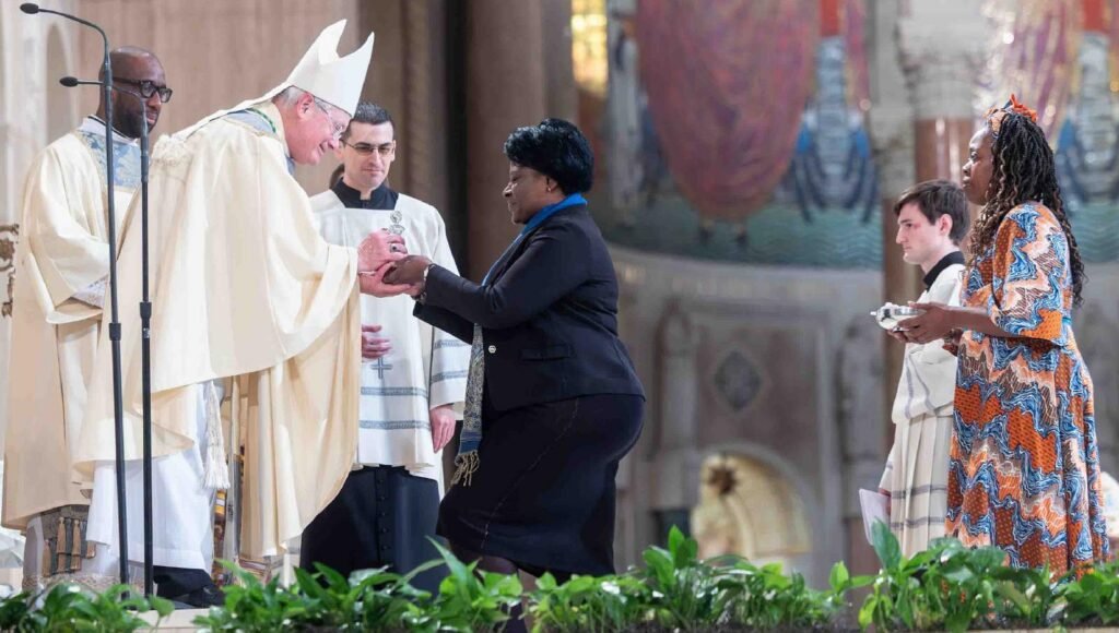Bishop David J. Malloy of Rockford, Ill., accepts offertory gifts from a woman during a “Mass for Solidarity with the Bishops and Faithful of Africa” Feb. 4, 2026, at the Basilica of the National Shrine of the Immaculate Conception in Washington. Bishop Malloy was the main celebrant and the concelebrants included Bishop Stephen Dami Mamza of of Yola, Nigeria, Bishop A. Elias Zaidan of the Maronite Eparchy of Our Lady of Lebanon in Los Angeles and Washington Auxiliary Bishop Evelio Menjivar-Ayala. (OSV News photo/Mihoko Owada, Catholic Standard)