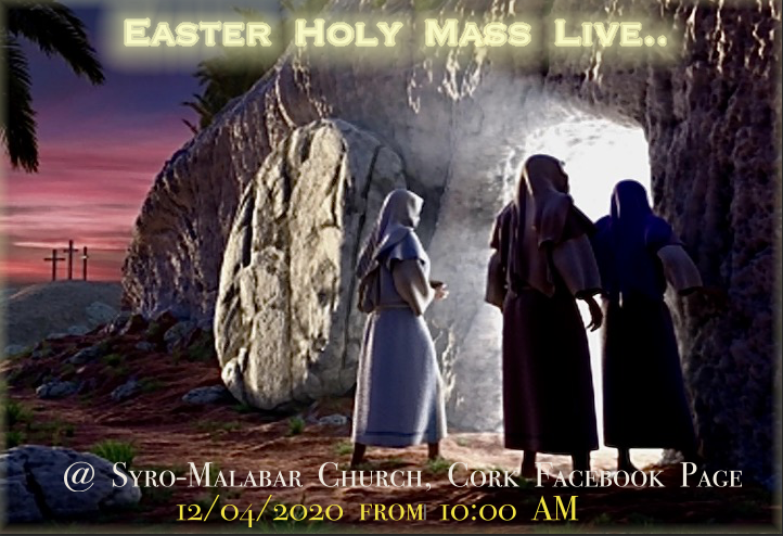 ഫാദർ സിബി അറക്കൽ അർപ്പിക്കുന്ന ദിവ്യബലിയും തിരുക്കർമ്മങ്ങളും സീറോ മലബാർ ചർച്ച് കോർക്ക് ഫേസ്ബുക് പേജിലൂടെ രാവിലെ പത്തുമണിമുതൽ ലൈവ് ആയി പ്രക്ഷേപണം ചെയ്യുന്നതാണ്. എല്ലാവരും അവരവരുടെ ഭവനങ്ങളിൽ ആയിരുന്നതുകൊണ്ട് ഭക്ത്യാദരപൂർവ്വം ഈസ്റ്റർ തിരുക്കർമ്മങ്ങളിൽ പങ്കുചേരണമെന്നഭ്യർഥിക്കുന്നു.
