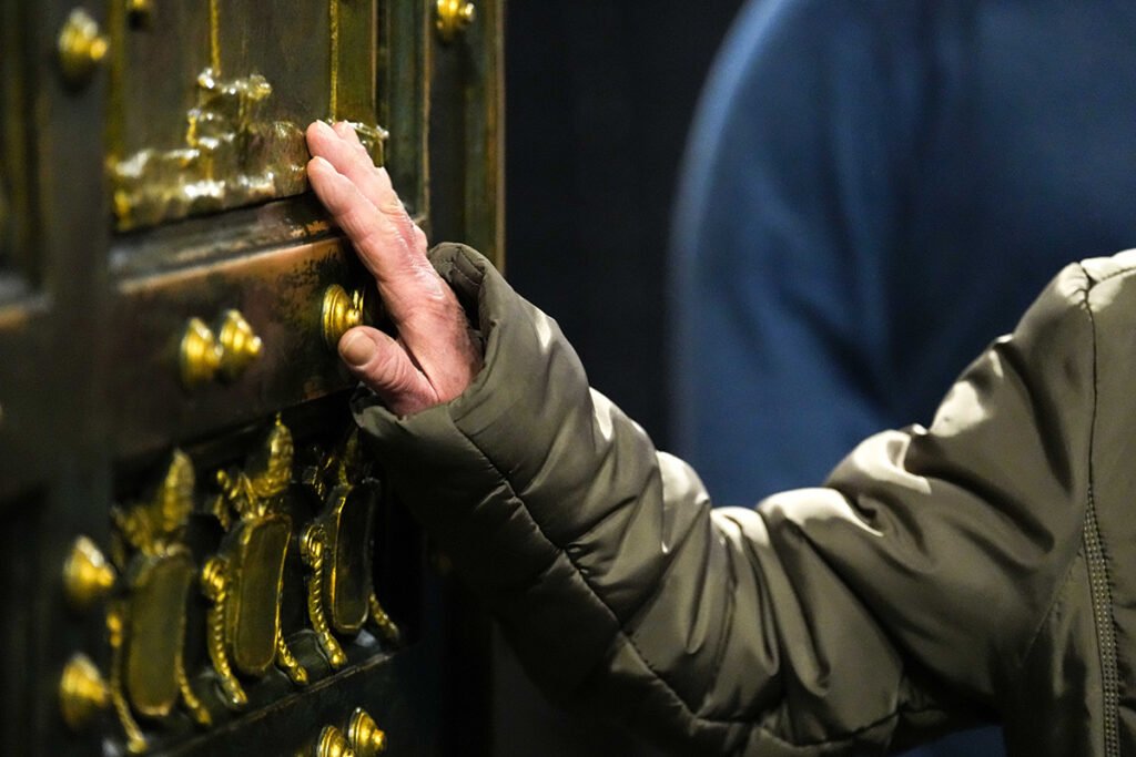 Those visitors who stopped to rest their heads against the depiction of the crucified Christ on the door or reverently touch the other panels were allowed to linger longer. And men and boys who forgot to pull off their hats or hoodies were given a stern look and a curt gesture by guards to remove their headwear.