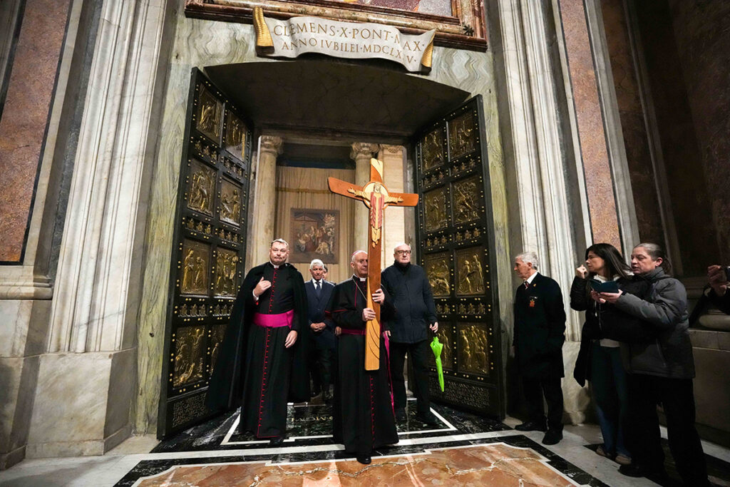 Archbishop Rino Fisichella, pro-prefect of the Dicastery for Evangelization, which organized the different Jubilees during the Holy Year, holds the Jubilee cross as he walks through the Holy Door at St. Peter’s Basilica with the last pilgrim group Jan. 5, 2026. It was the last day the door was open to the public before its closing by Pope Leo XIV Jan. 6 to conclude the Holy Year. (CNS photo/Lola Gomez)