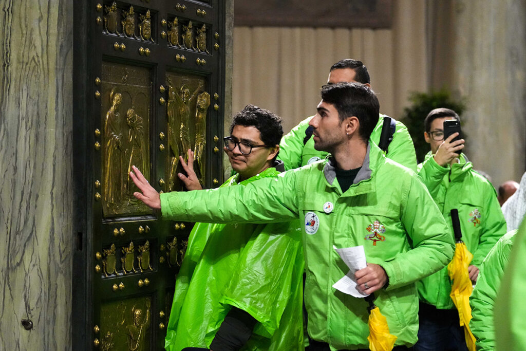Jubilee volunteers touch the Holy Door at St. Peter’s Basilica at the Vatican Jan. 5, 2026, the last day it remained open before Pope Leo XIV officially closed it Jan. 6 to mark the end of the Holy Year. (CNS photo/Lola Gomez)