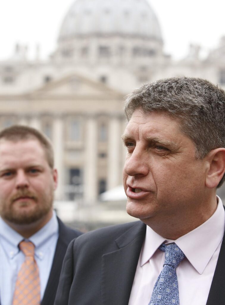 Randall Terry, founder of Operation Rescue, is pictured in a file photo talking to the media after a brief photo opportunity for the press outside the Vatican. On Feb. 3, 2026, in Memphis, Tenn., charges were dropped against activist Terry and 16 others for a Dec. 5, 2025, demonstration at a Planned Parenthood clinic there. (CNS photo/Paul Haring)