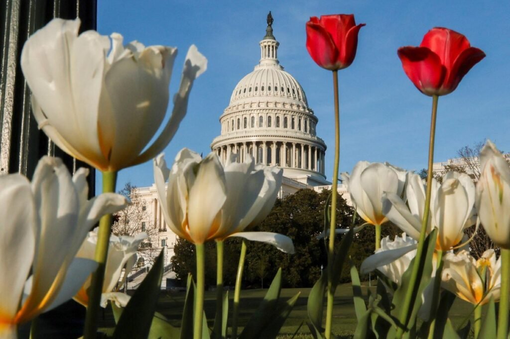 Tulips bloom near the U.S. Capitol during sunset in Washington April 8, 2026. (OSV News photo/Jessica Koscielniak, Reuters)