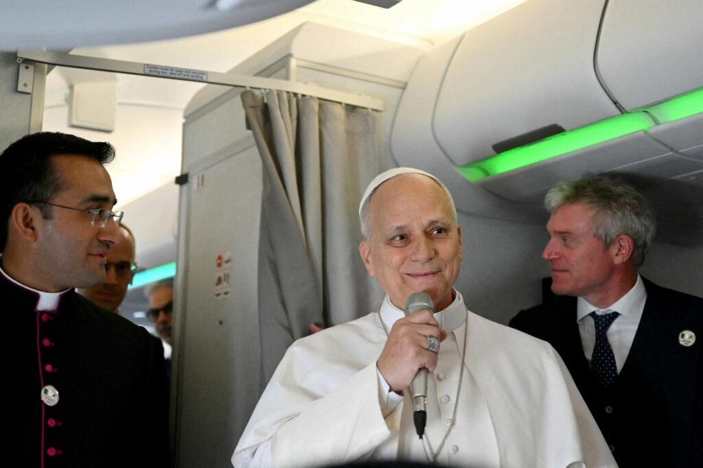 Pope Leo told journalists aboard the papal plane to Algiers, Algeria, on April 13, that he is not a politician, but he will “continue to speak out loudly against war, looking to promote peace, promoting dialogue and multilateral relationships among the States to look for just solutions to problems.”